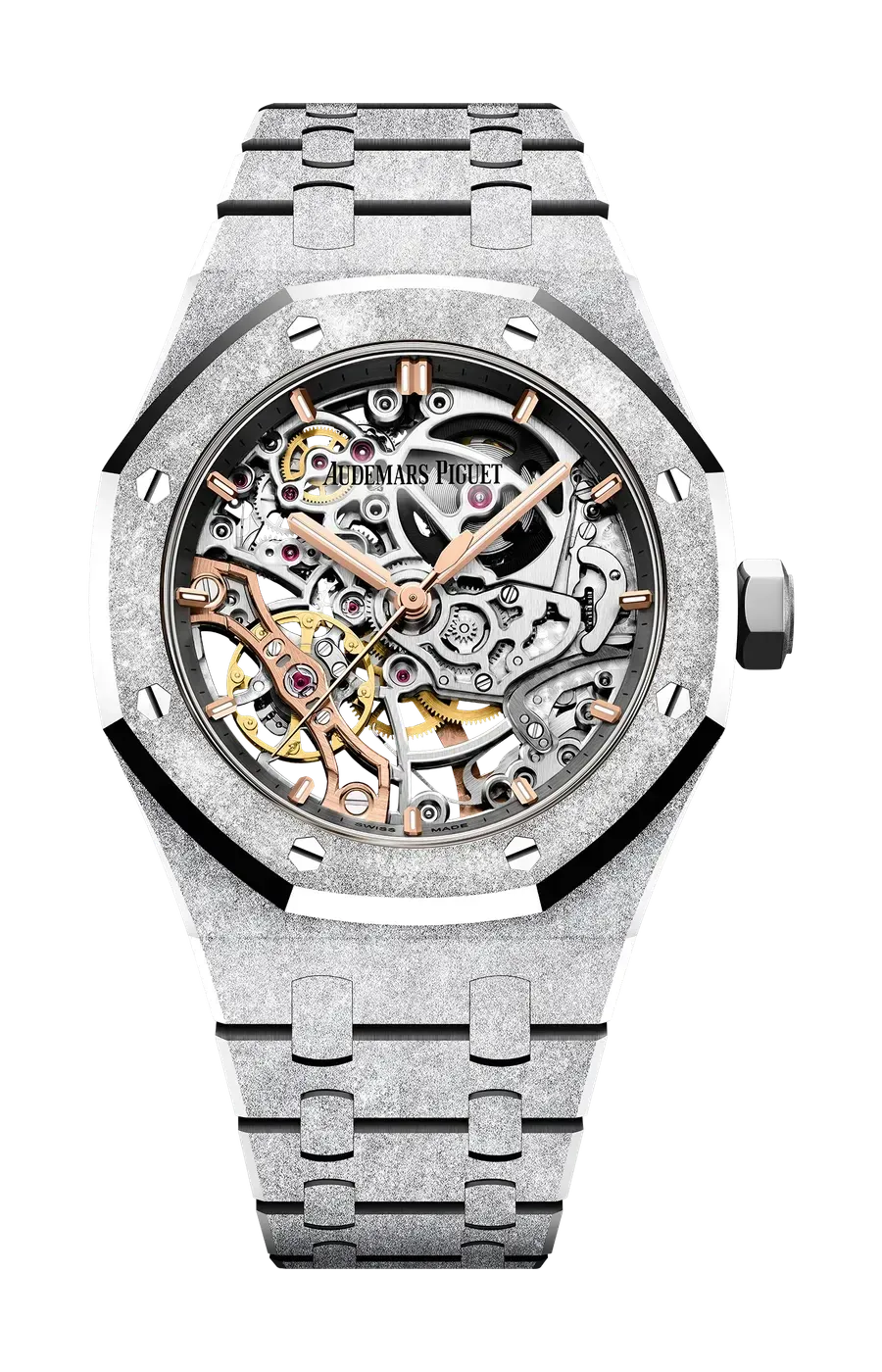 Openworked rhodium-toned dial, pink gold applied hour-markers and Royal Oak hands with luminescent coating.