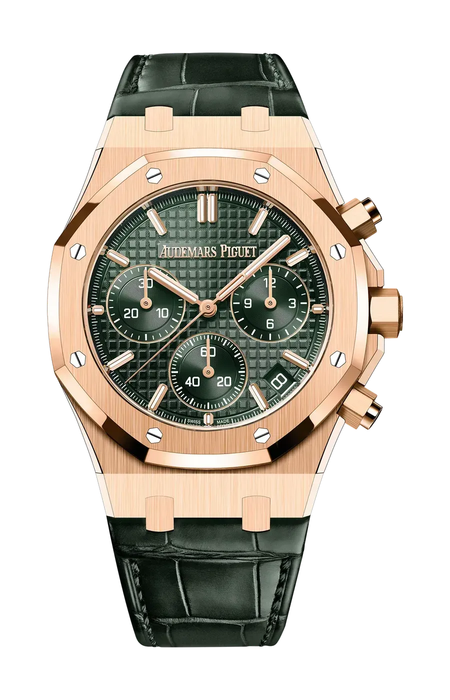 Khaki green alligator strap with 18-carat pink gold AP folding clasp.