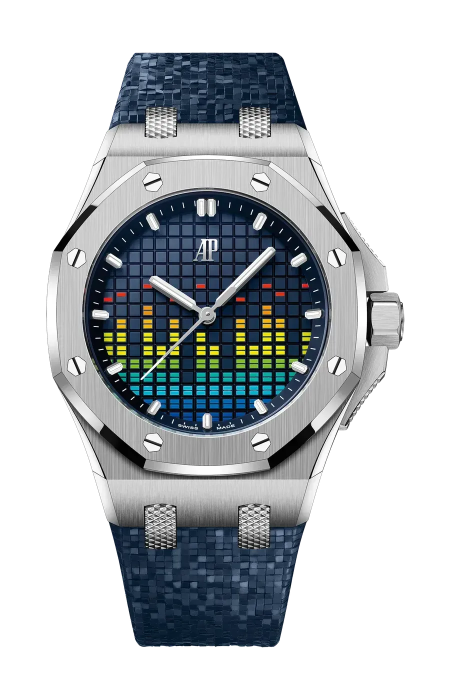 Blue dial with printed VU meter, white gold applied hour-markers and Royal Oak hands with luminescent coating.