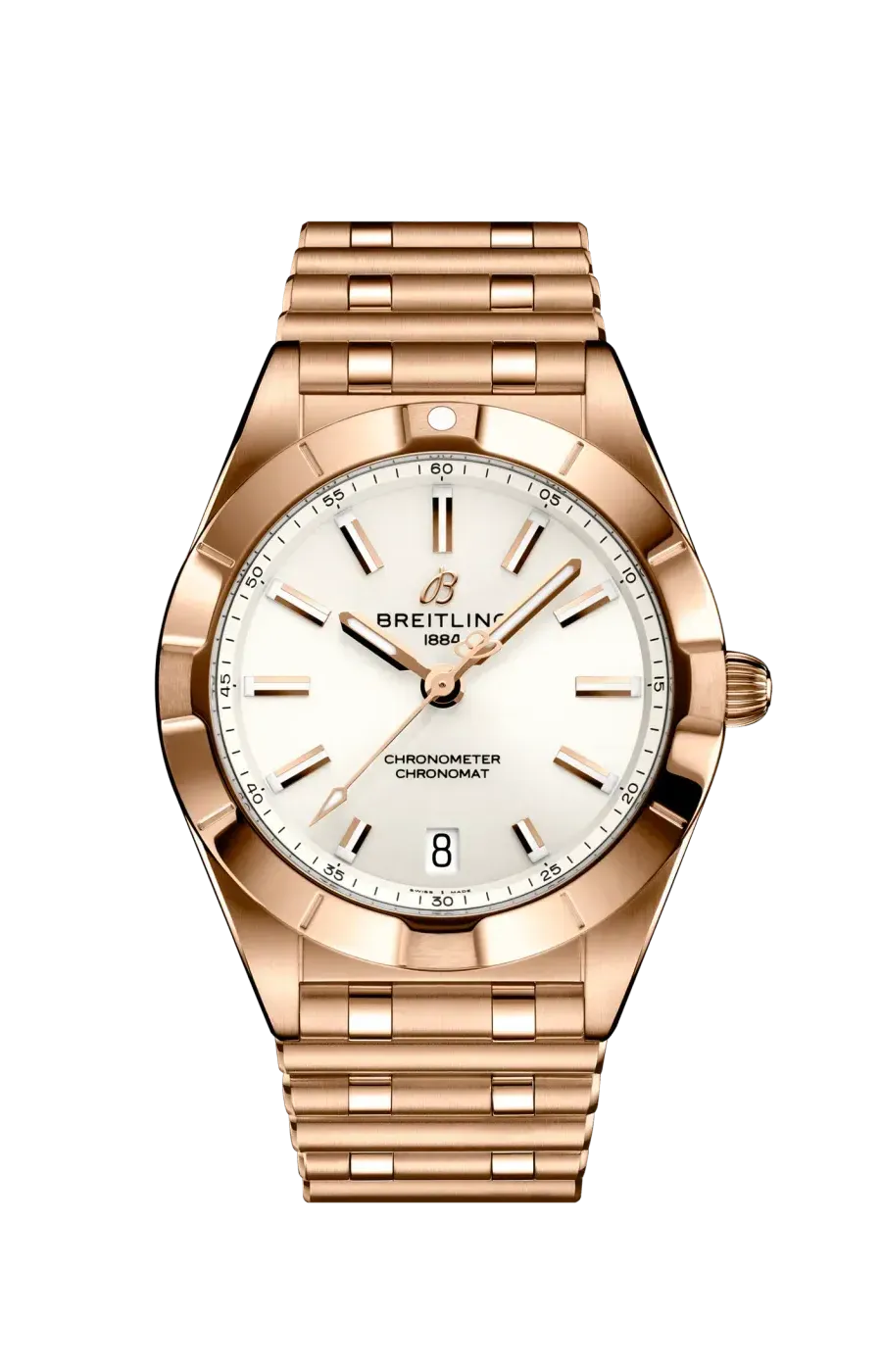The Chronomat 32 is a modern-retro inspired watch with a versatile design perfect for any occasion. Choose from stainless steel, bicolor, or 18k red gold metal cases, and opt for diamond-set bezels, indices, and colorful dials for added sparkle. Comfortable "Rouleaux" bracelet with butterfly clasp, and powered by Breitling Caliber 77, a COSC-certified SuperQuartz™ chronometer. Elevate any look with the Chronomat 32.