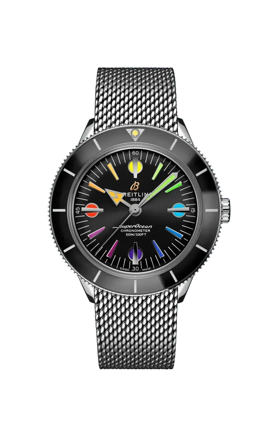 This limited edition 42mm Superocean Heritage ’57 features a stainless-steel case with a concave bidirectional ceramic bezel and oversized indices. Includes a mesh bracelet or a black calfskin leather strap with a stainless-steel pin or folding buckle. Powered by the Breitling Caliber 10, a COSC-certified chronometer. Limited edition of 250 pieces. Dial up your style with this colorful timepiece.