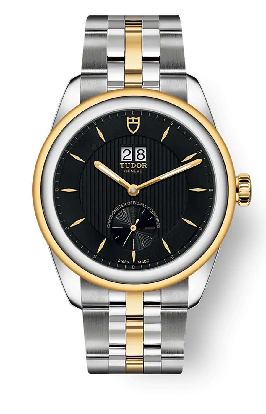 Black with rhodium-plated or yellow gold-plated hour markersSmall seconds at 6 o'clockLarge date in a double window at 12 o'clock