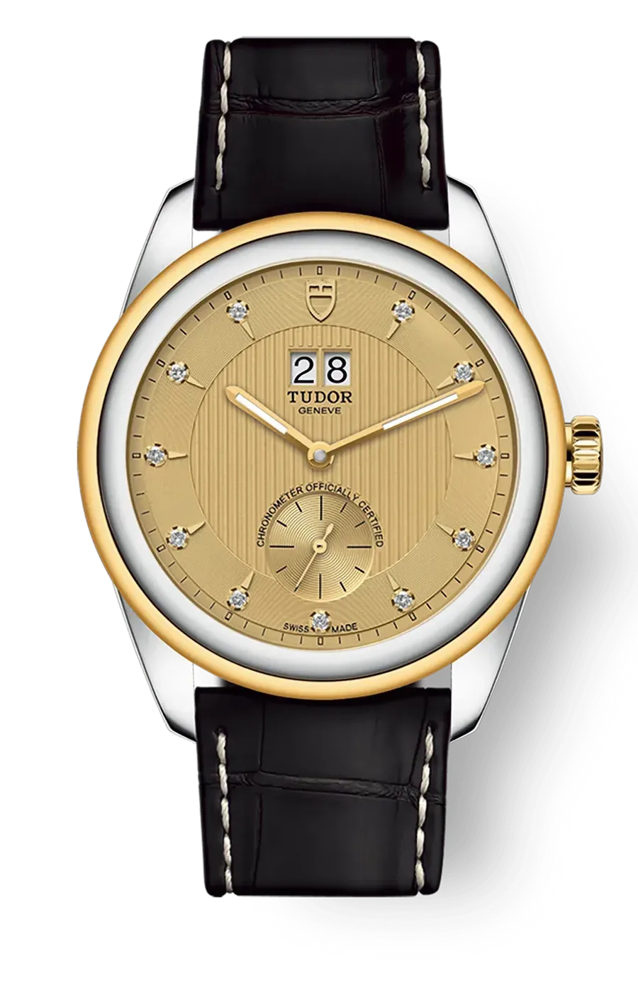 Champagne-colour with yellow gold-plated hour markers with 11 diamondsSmall seconds at 6 o'clockLarge date in a double window at 12 o'clock