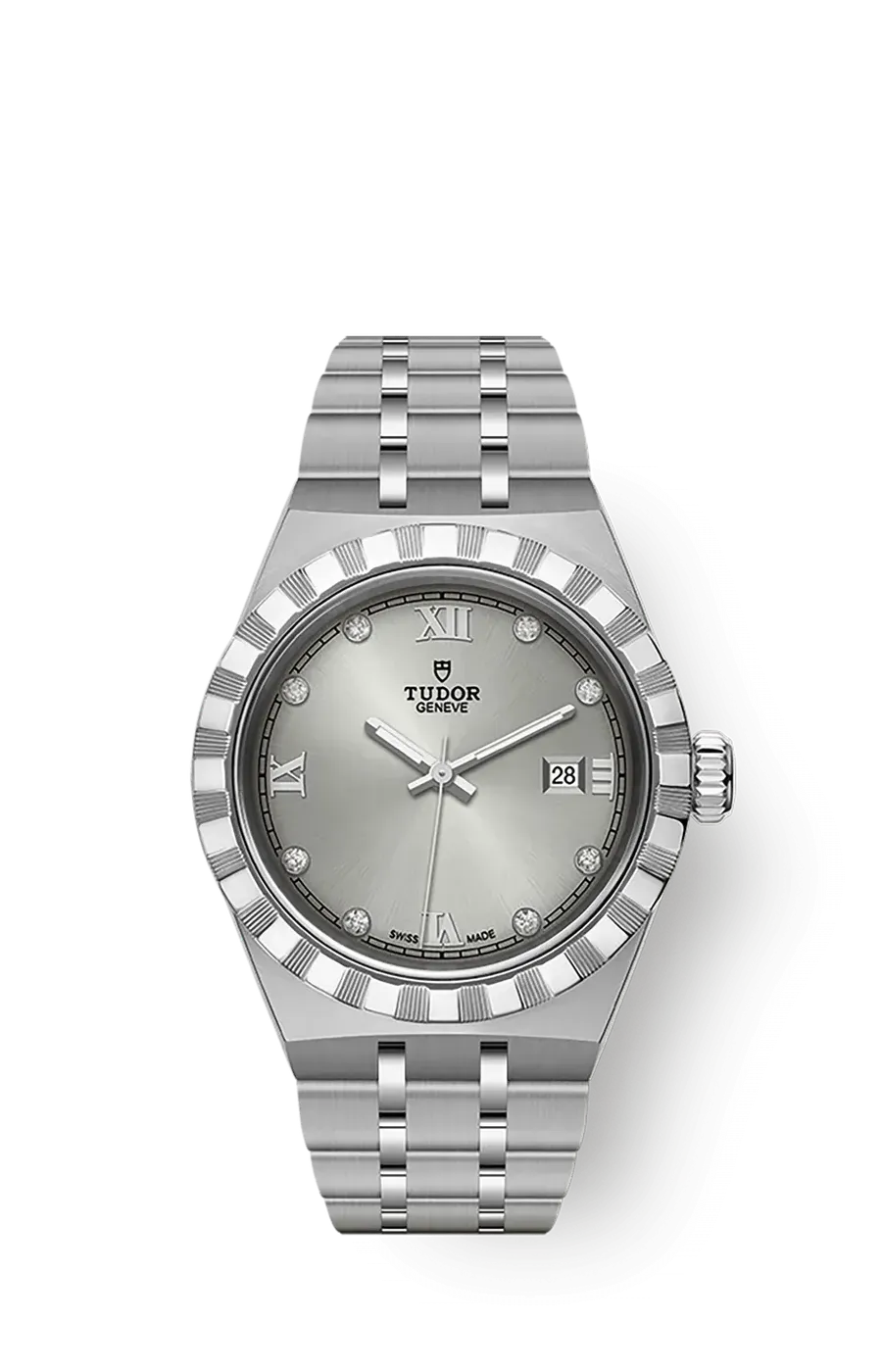 Silver, sunray-finish, with diamondsApplied Roman numeralsDate at 3 o'clock