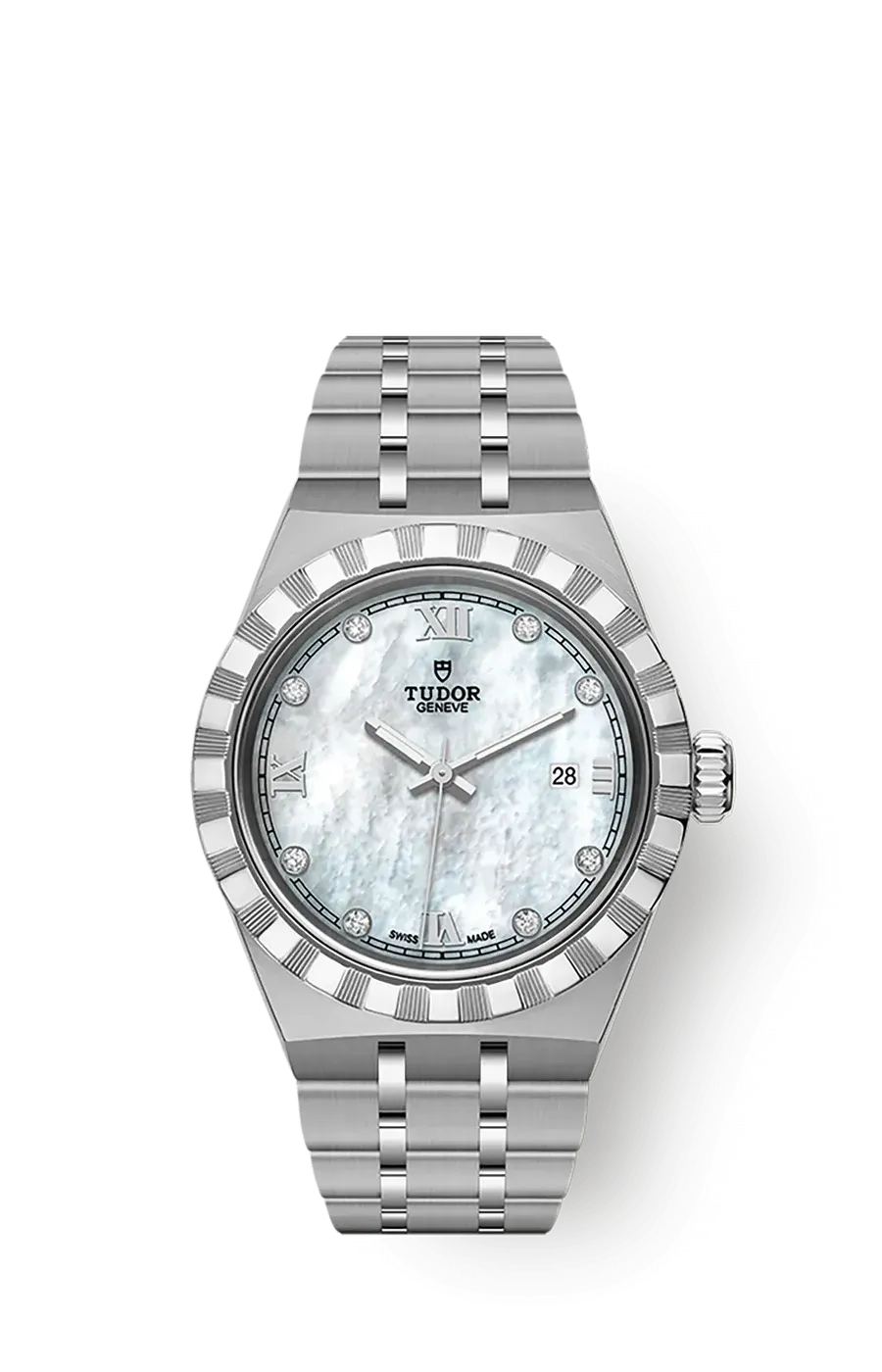 Gem-set white mother-of-pearlApplied Roman numeralsDate at 3 o'clock