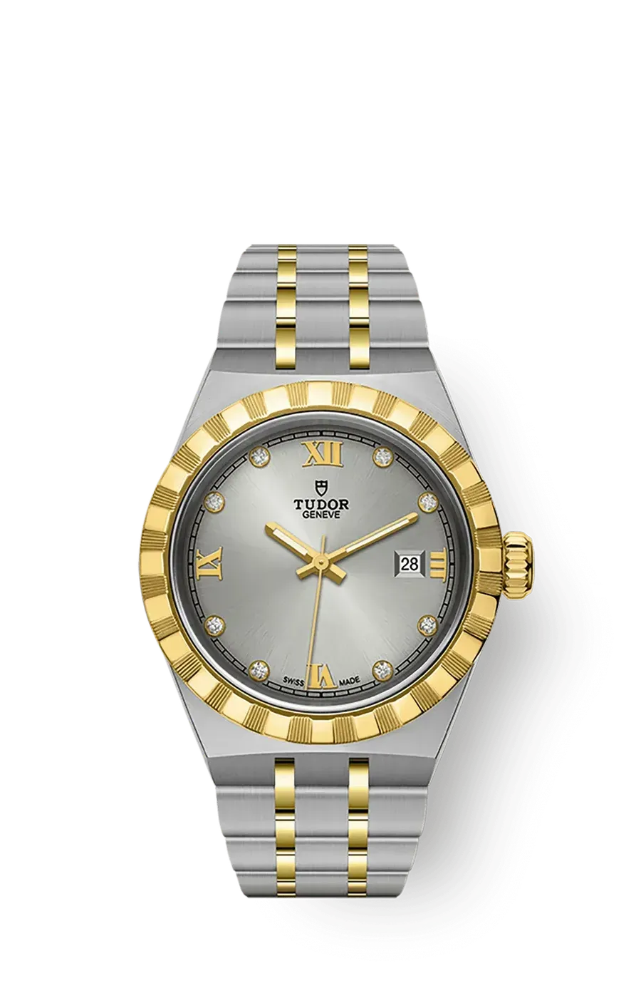 Silver, sunray-finish, with diamondsApplied Roman numeralsDate at 3 o'clock