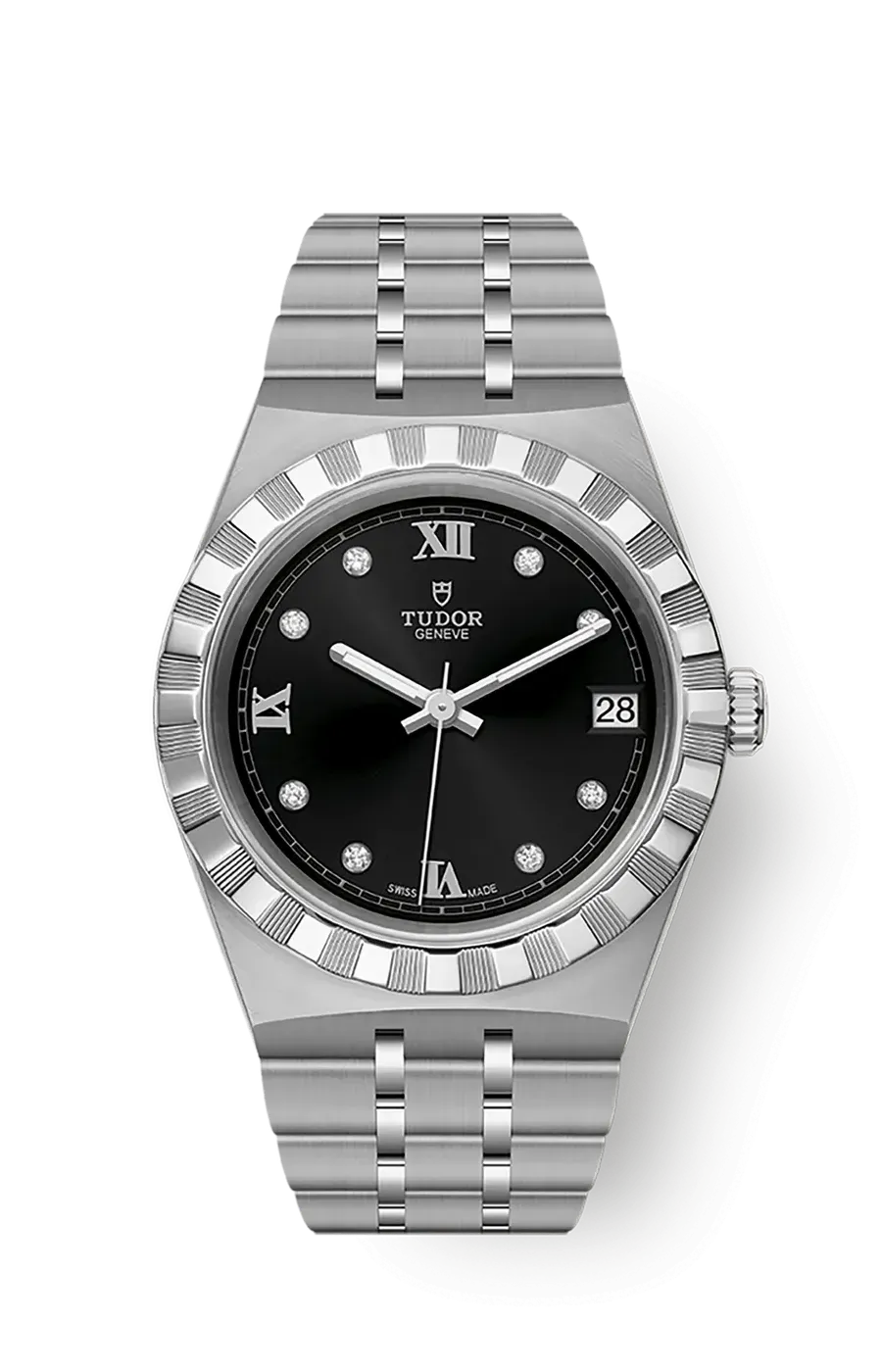 Black, sunray-finish, with diamondsApplied Roman numeralsDate at 3 o'clock