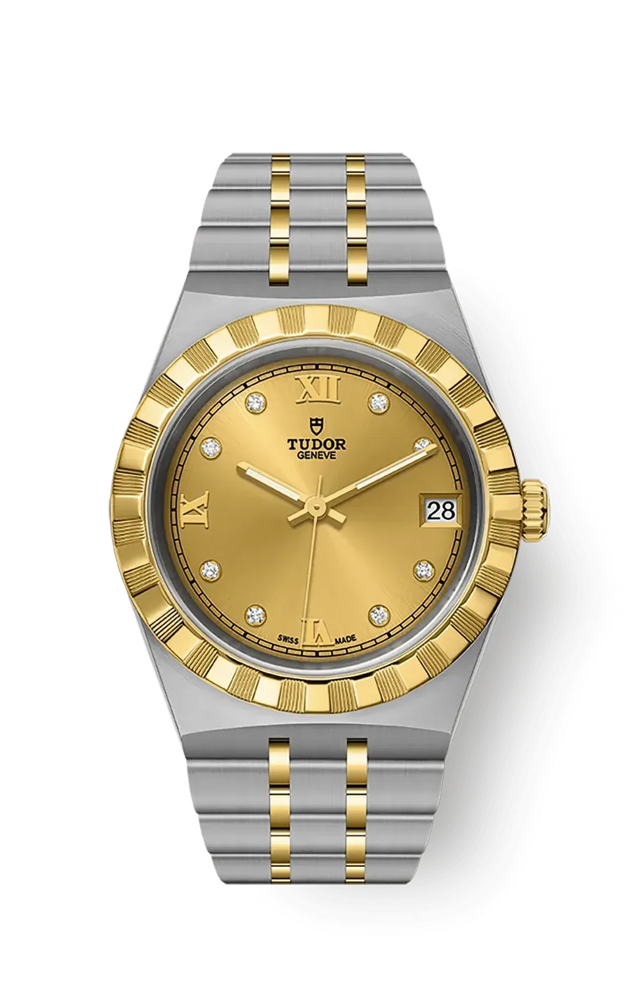 Champagne-colour, sunray-finish, with diamondsApplied Roman numeralsDate at 3 o'clock