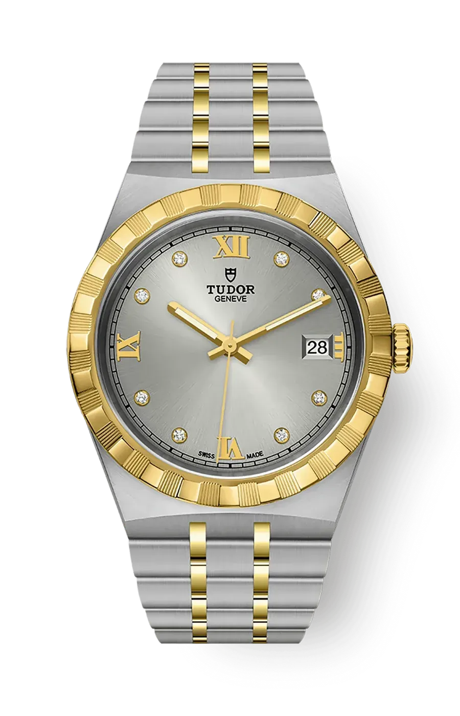 Silver, sunray-finish, with diamondsApplied Roman numeralsDate at 3 o'clock
